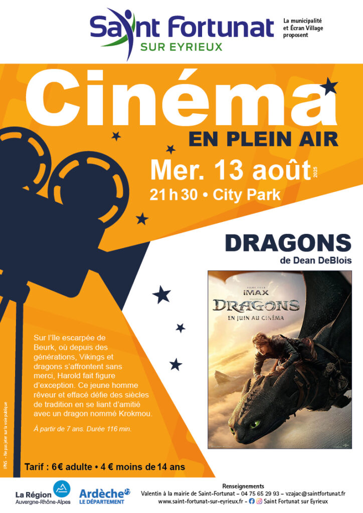 Pour cette deuxième séance de cinéma en plein air, l’association Écran Village vous proposera « Dragons » de Dean DeBlois, le film d’aventure fantastique adapté de la série éponyme.